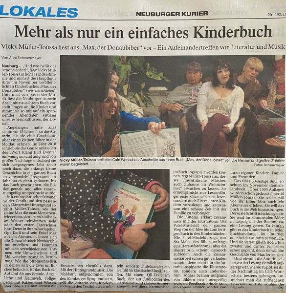Das Schreiben begleitet Vicky Müller-Toùssa schon seit ihrer Schulzeit und auch die Idee dieses Buches fand als musikalisches Märchen in Zusammenarbeit mit Musikern der Bamberger Symphoniker vor 15 Jahren bereits ihren Ursprung. Das Licht der Welt erblickte unsere Autorin übrigens 1981 in Augsburg. Auf einer Schauspielschule in München und später in Regensburg erlernte sie ihr „Handwerk“. Sie zog sodann als freischaffende Theaterschauspielerin jahrzehntelang durch die Lande. Dabei agiert sie gern spartenübergreifend. Über 35 Theaterprojekte, ob Kindertheater, musikalische Märchen, Tragödien wie Komödien oder Szenische Themen/Stadtführungen, hat sie bisher national, auch auf Festivals, aufgeführt. So vielfältig sieht auch ihr Lebenslauf aus. Eine ausgeführte Tätigkeit ergab meist die nächste Aufgabe. Sodass sie neben Auftritten, auch Regie führte, Theaterstücke schrieb, Kostüme nähte, an Bühnenbildern werkelte und baute, theaterpädagogisch unterrichtete, viele Veranstaltungen mit organisierte und auch moderierte. Vicky Müller-Toùssa hält überdies als freie Rednerin diverse Zeremonien ab, die sie auch individuell verfasst. Seit Februar 2022 ist sie als Reporterin in der Region 10 für TV Ingolstadt mit ihrer eigenen Sendung - ein soziales Gesellschaftsmagazin namens „Miteinander“ - unterwegs. Die Autorin lebt glücklich zusammen mit ihrem Mann und den gemeinsamen zwei Söhnen (die sie gehörig auf Trab halten) seit 2011 in Neuburg an der Donau, der Heimat des kleinen Biber Max aus dieser Geschichte.